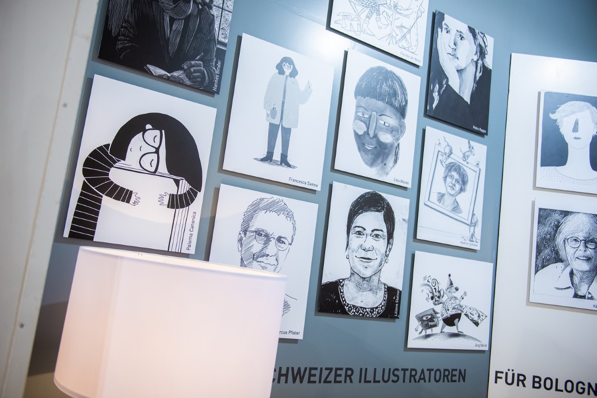 Eine Wand am SBVV-Stand zeigt Selbstporträts der Illustratorinnen und Illustratoren in Bologna 2019.